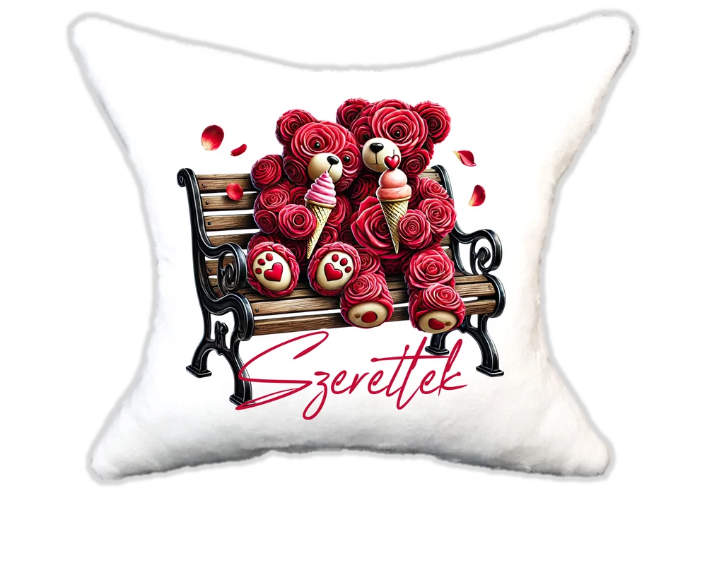 Cuki Szerelmes Rózsamacik padon fagyival Plüsspárna – Extra Puha, Egyedi Felirattal is kérheted. Mérete:32*34 |