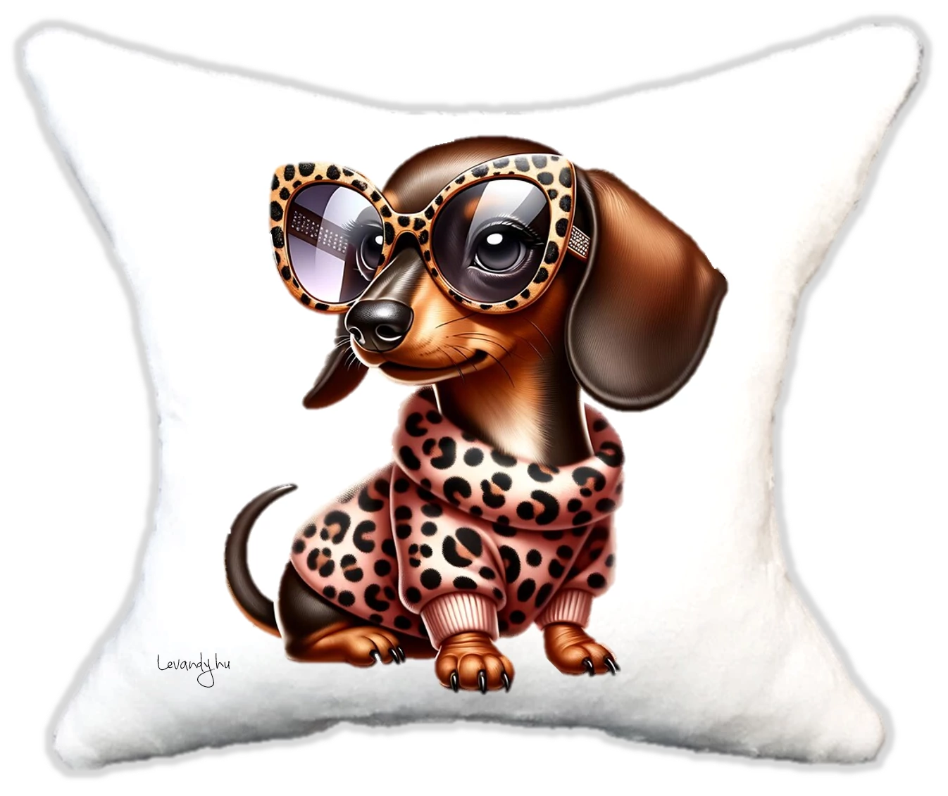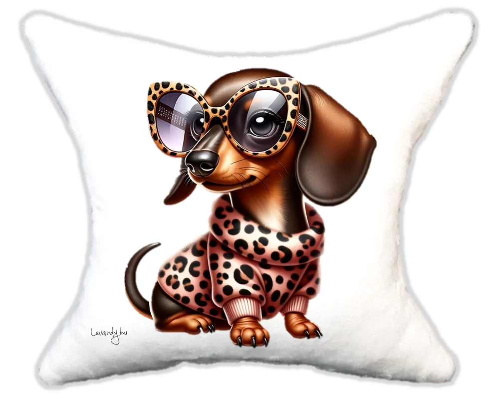 Cuki Szerelmes tacskó leopárdos ruhában Plüsspárna – Extra Puha, Egyedi Felirattal is kérheted. Mérete:32*34 |