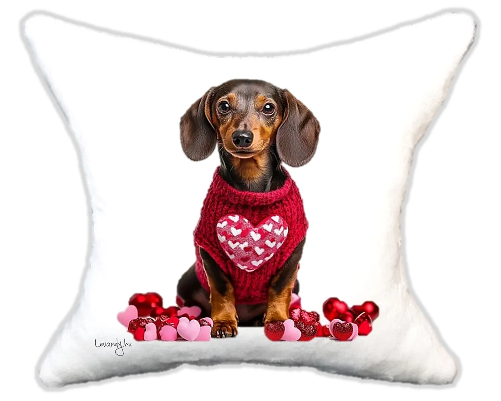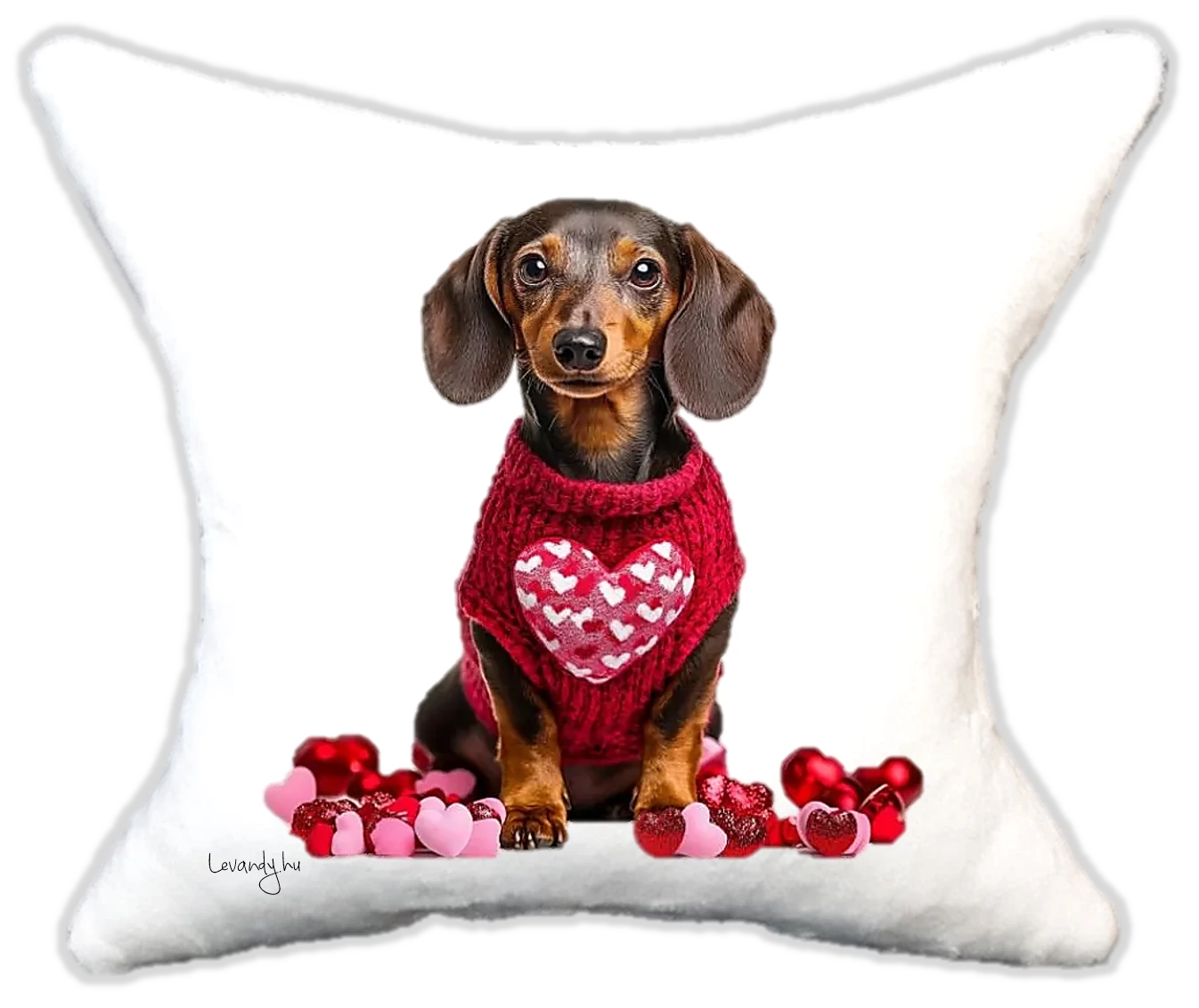 Cuki Szerelmes tacskó szíves pulcsiban Plüsspárna – Extra Puha, Egyedi Felirattal is kérheted. Mérete:32*34 |