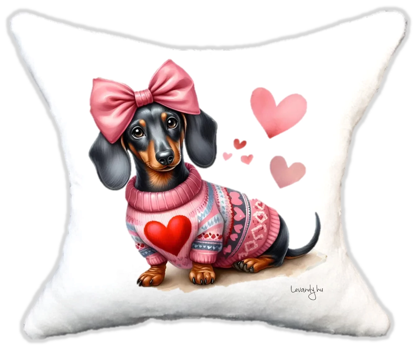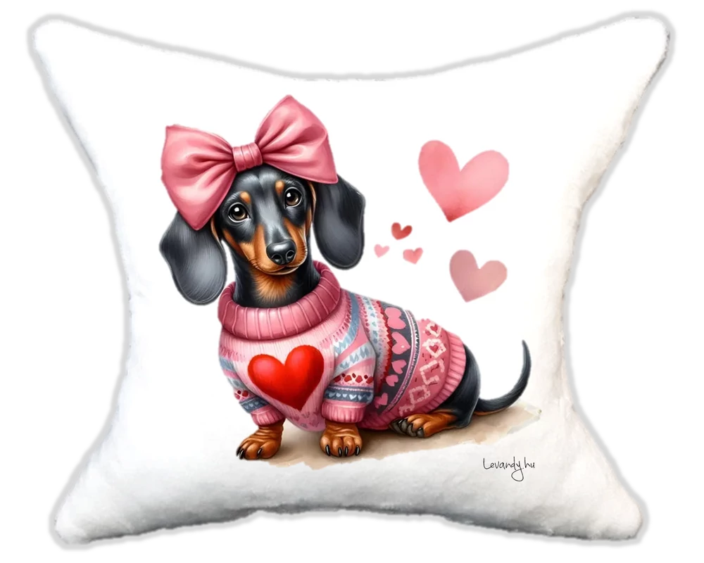 Cuki Szerelmes tacskó szíves pulcsiban masnival Plüsspárna – Extra Puha, Egyedi Felirattal is kérheted. Mérete:32*34 |