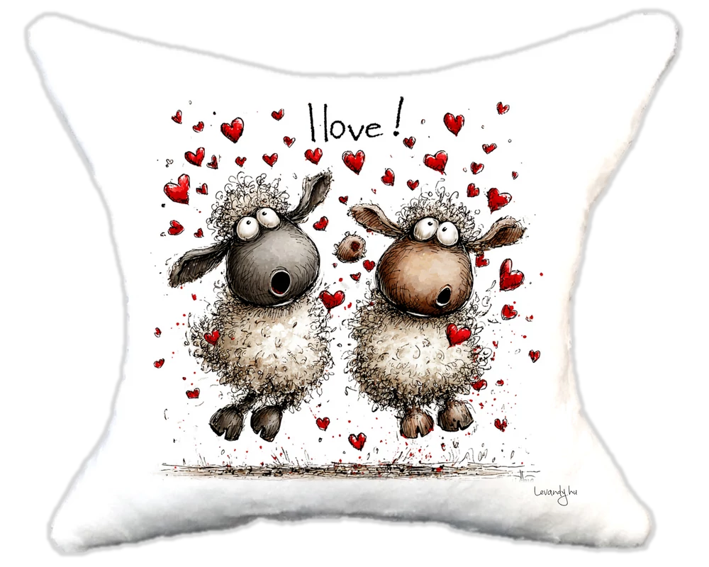 A szerelmes báránykás grafika modern, kedves és figyelemfelkeltő – így nemcsak egy plüsspárna, hanem egy stílusos dekoráció is, amely bármelyik helyiséget barátságosabbá tesz.